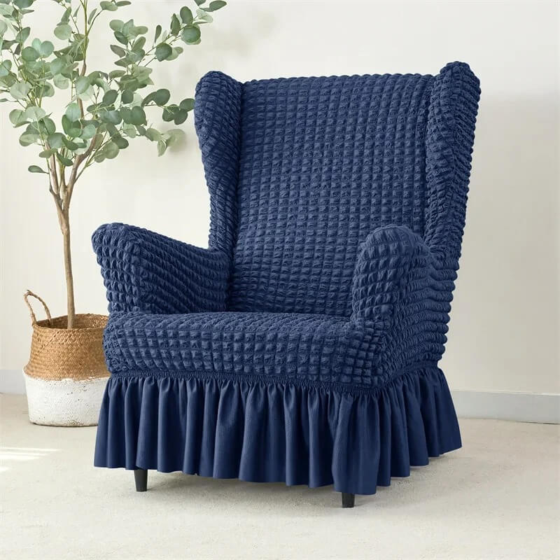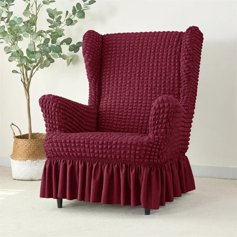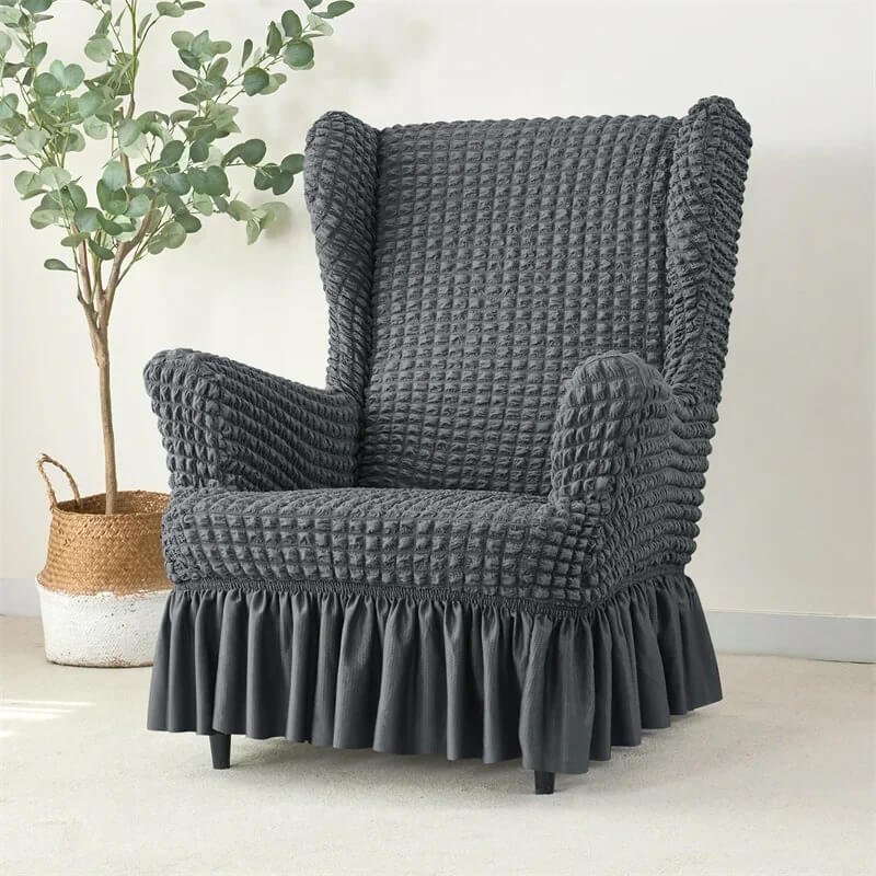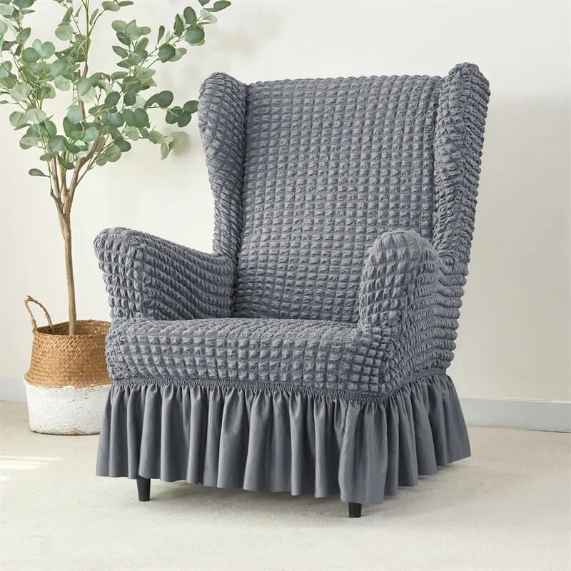 Oferujemy Państwu super praktyczny i uniwersalny żakardowy pokrowiec z falbaną na fotel typu norweskiego - uszak