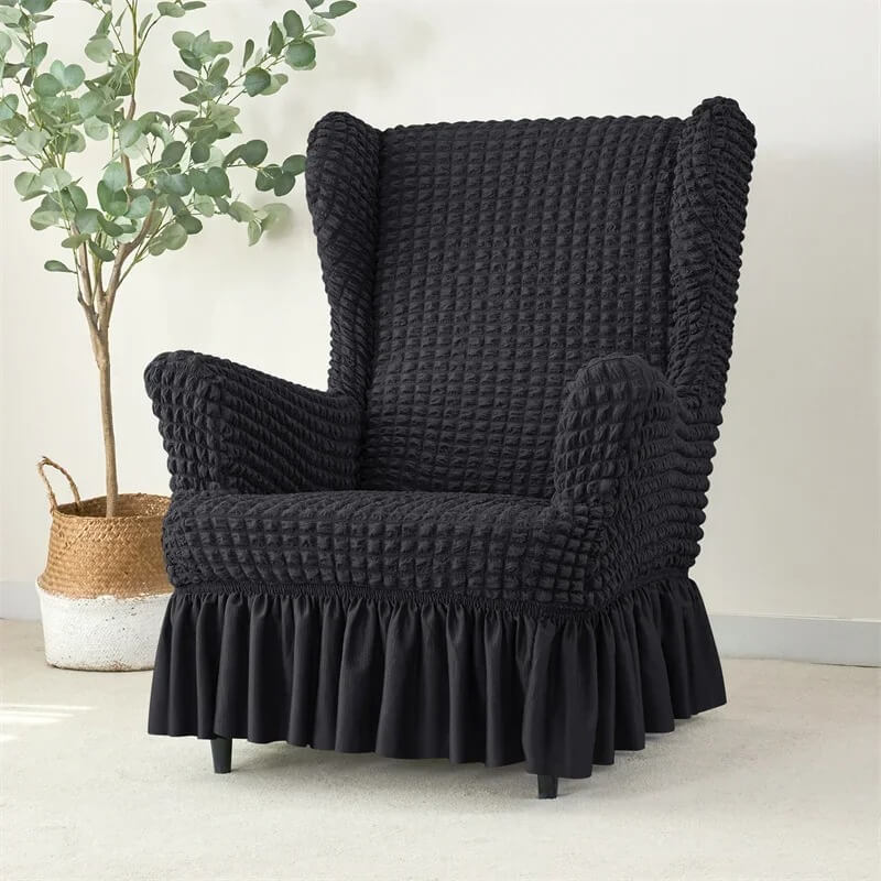 Oferujemy Państwu super praktyczny i uniwersalny żakardowy pokrowiec z falbaną na fotel typu norweskiego - uszak