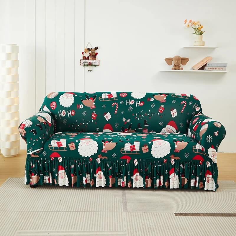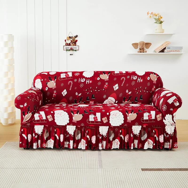 Świąteczny pokrowiec na kanapę - sofę z falbaną - Red Santa